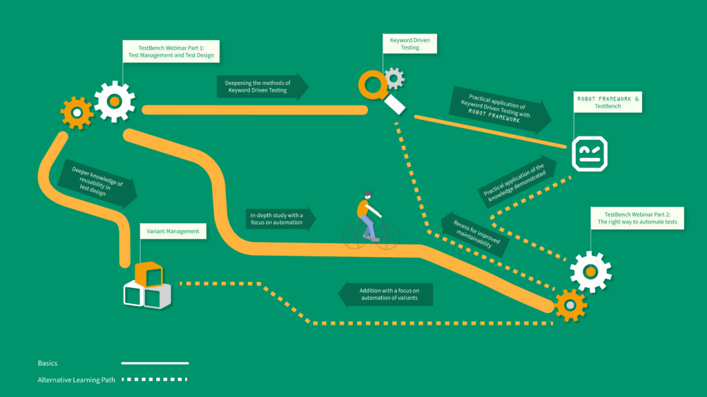 The TestBench map helps you expand your knowledge of professional testing in a targeted manner. It shows you how the various topics and webinars are linked.